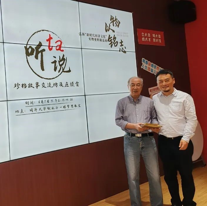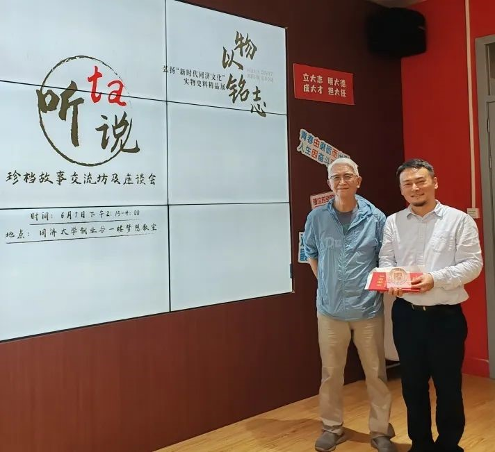 揭幕仪式后,珍贵档案捐赠人代表李乐曾、谭国璋、林长川、张为诚、张宗贤、罗东平、孙飞飞等参加了“听ta说”珍档故事交流坊及座谈会,在会上进行了热烈的交流,向与会师生讲述了珍贵档案背后的故事,并对学校的档案征集工作提出宝贵建议。建筑与城市规划学院退休教授张为诚在交流坊现场还向档案馆捐赠了他设计的上海铁道大学校徽及获奖证书等全套珍贵资料。档案馆向珍档捐赠人上海音乐学院退休教授谭国璋先生赠送了其捐赠品的复制件以示纪念。谭国璋先生向同济大学档案馆先后捐赠了其祖父、同济大学1916届毕业生谭岳峰在1912年的生理学笔记、同济大学1915年同学录以及谭岳峰行医所用光学检眼镜。近年来,不少师生校友及社会各界人士对同济大学档案工作非常关注并给予直接支持,通过多种形式向学校档案馆捐赠了学校办学各个历史时期的珍贵档案,部分档案在此次展览中展出。