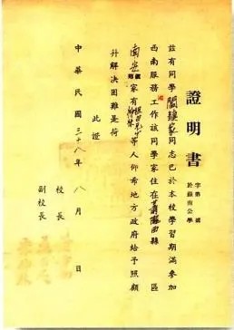 1949年8月,苏南公学为阎镇家参加西南服务团出具的证明书