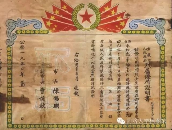 1950年2月,重庆市人民政府颁发的“烈属优待证明书”