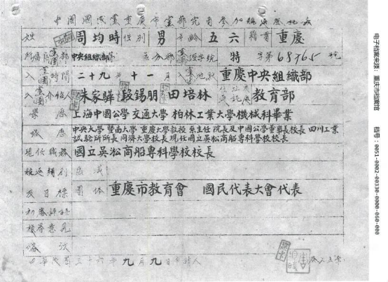 周均时的“中国国民党重庆市党部党员参加竞选登记表”