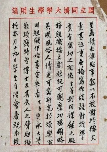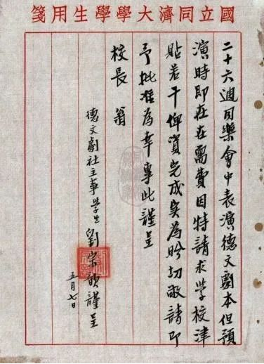 图:1937年5月,因发起成立“德文剧社”,刘宗歆特向学校申请经费