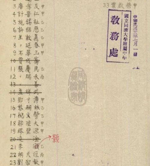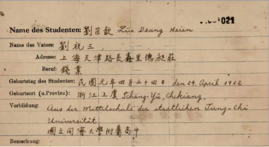 图:刘宗歆在国立同济大学附属中学就读的学籍登记卡
