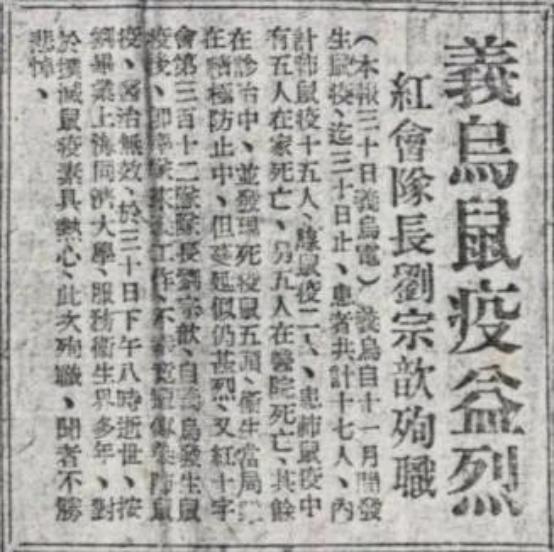 1942年1月,《东南日报》刊发题为《义乌鼠疫益烈,红会队长刘宗歆殉职》的快讯,对刘宗歆的不幸殉职表示哀悼:“红十字会第312队队长刘宗歆,自义乌发生鼠疫后,即率队来义乌工作,不幸竟遭传染肺鼠疫,医治无效,于30日下午8时逝世。按:刘毕业于上海同济大学,服务卫生界多年,刘于扑灭鼠疫素具热心,此次殉职,闻者不胜悲悼。”