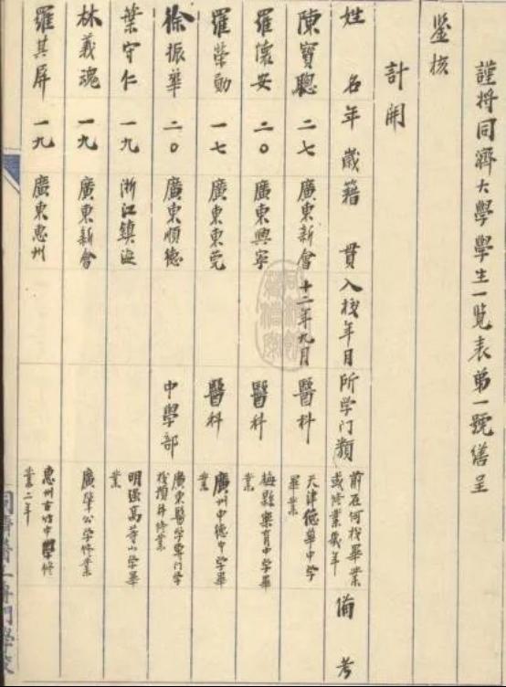 图:1923年《同济大学学生一览表》中记载的罗其屏进入附中学习的信息